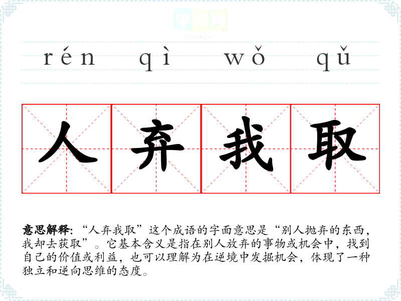 “人弃我取”这个成语的字面意思是“别人抛弃的东西,我却去获取”。它基本含义是指在别人放弃的事物或机会中,找到自己的价值或利益,也可以理解为在逆境中发掘机会,体现了一种独立和逆向思维的态度。