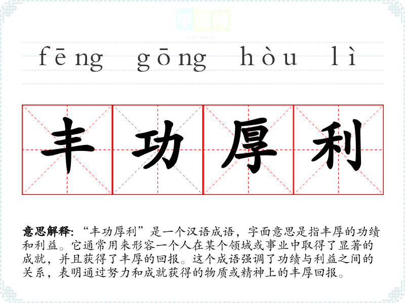 “丰功厚利”是一个汉语成语,字面意思是指丰厚的功绩和利益。它通常用来形容一个人在某个领域或事业中取得了显著的成就,并且获得了丰厚的回报。这个成语强调了功绩与利益之间的关系,表明通过努力和成就获得的物质或精神上的丰厚回报。