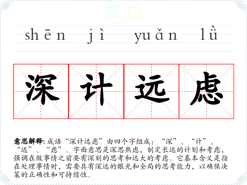 成语“深计远虑”由四个字组成:“深”、“计”、“远”、“虑”。字面意思是深思熟虑,制定长远的计划和考虑,强调在做事情之前要有深刻的思考和远大的考虑。它基本含义是指在处理事情时,需要具有深远的眼光和全局的思考能力,以确保决策的正确性和可持续性。