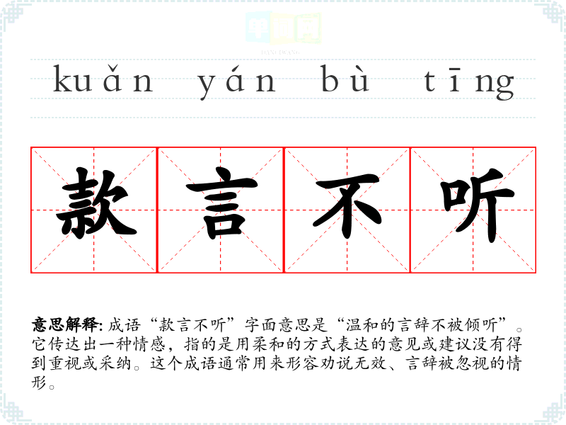 成语“款言不听”字面意思是“温和的言辞不被倾听”。它传达出一种情感,指的是用柔和的方式表达的意见或建议没有得到重视或采纳。这个成语通常用来形容劝说无效、言辞被忽视的情形。