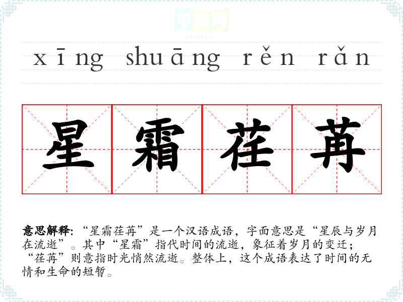 | 星霜荏苒 | 星霜:星辰运转一年一次循环,每年秋季始降霜,因以批岁月。指岁月渐渐流逝。 |