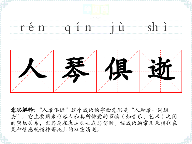“人琴俱逝”源于古代文人对音乐和情感的深刻理解。在古代,琴不仅仅是一种乐器,更是文人雅士情感寄托的一部分。这个成语常常与古代文人因爱好音乐而产生的情感联系在一起。尽管具体出处不详,但可以推测与古代诗词或散文中对琴的描写有关。