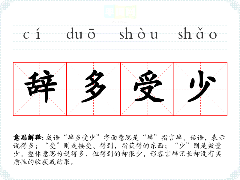 成语“辞多受少”字面意思是“辞”指言辞、话语,表示说得多;“受”则是接受、得到,指获得的东西;“少”则是数量少。整体意思为说得多,但得到的却很少,形容言辞冗长却没有实质性的收获或结果。