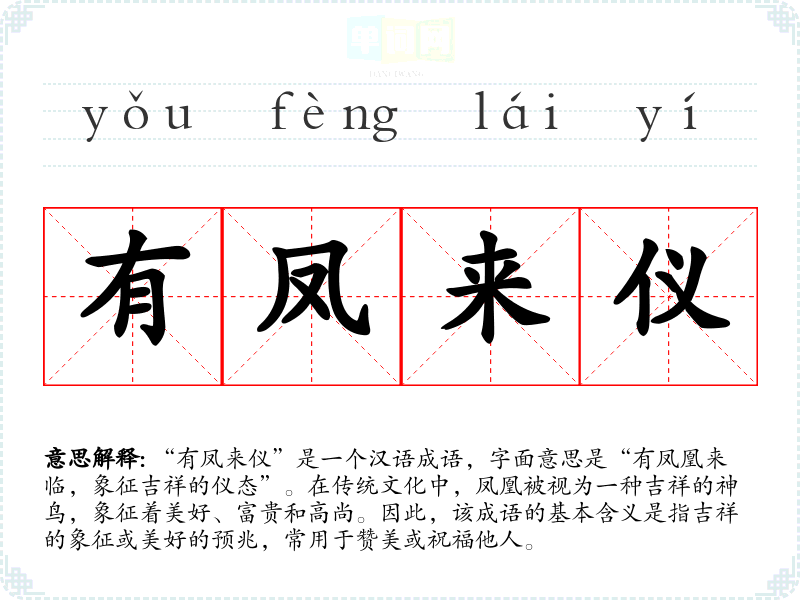 “有凤来仪”是一个汉语成语,字面意思是“有凤凰来临,象征吉祥的仪态”。在传统文化中,凤凰被视为一种吉祥的神鸟,象征着美好、富贵和高尚。因此,该成语的基本含义是指吉祥的象征或美好的预兆,常用于赞美或祝福他人。