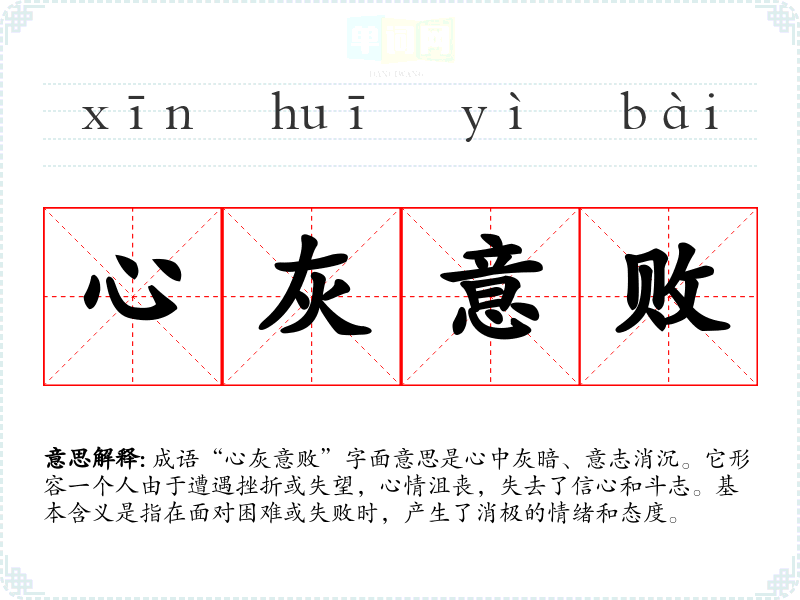 成语“心灰意败”字面意思是心中灰暗、意志消沉。它形容一个人由于遭遇挫折或失望,心情沮丧,失去了信心和斗志。基本含义是指在面对困难或失败时,产生了消极的情绪和态度。