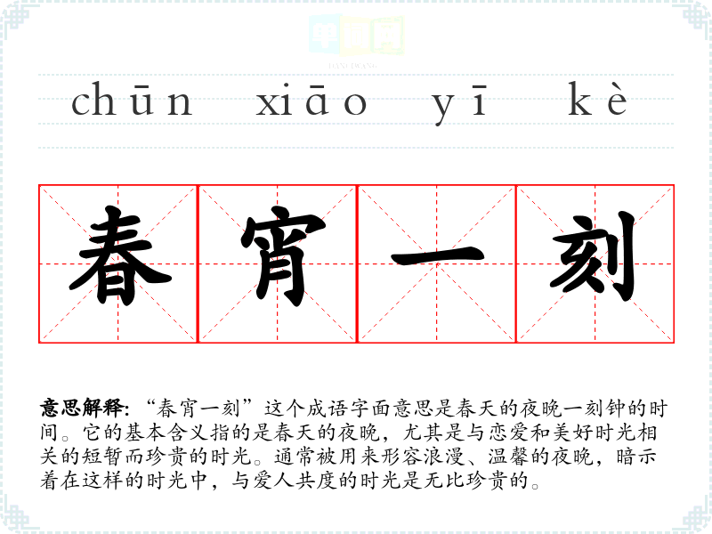 “春宵一刻”这个成语字面意思是春天的夜晚一刻钟的时间。它的基本含义指的是春天的夜晚,尤其是与恋爱和美好时光相关的短暂而珍贵的时光。通常被用来形容浪漫、温馨的夜晚,暗示着在这样的时光中,与爱人共度的时光是无比珍贵的。