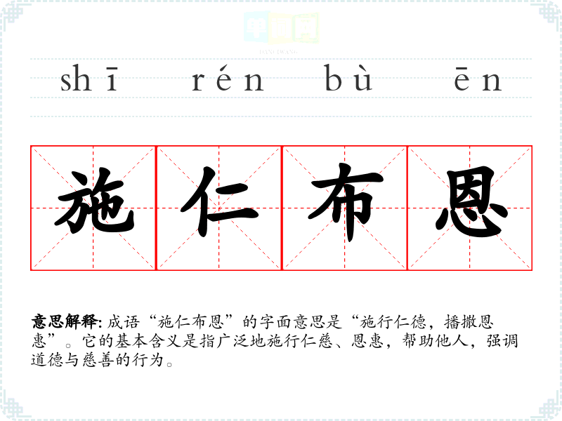 成语“施仁布恩”的字面意思是“施行仁德,播撒恩惠”。它的基本含义是指广泛地施行仁慈、恩惠,帮助他人,强调道德与慈善的行为。