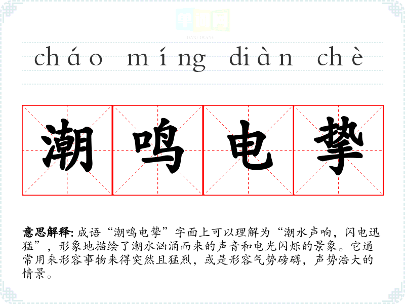 成语“潮鸣电挚”字面上可以理解为“潮水声响,闪电迅猛”,形象地描绘了潮水汹涌而来的声音和电光闪烁的景象。它通常用来形容事物来得突然且猛烈,或是形容气势磅礴,声势浩大的情景。