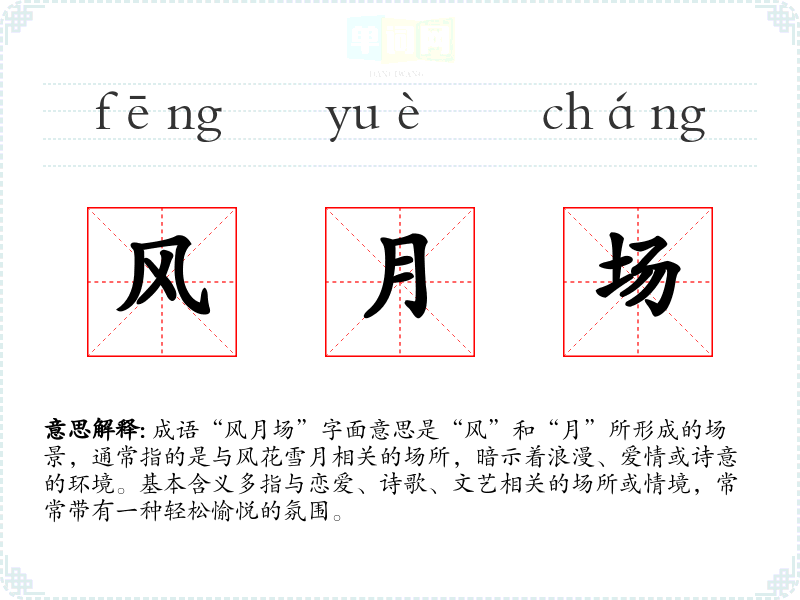 成语“风月场”字面意思是“风”和“月”所形成的场景,通常指的是与风花雪月相关的场所,暗示着浪漫、爱情或诗意的环境。基本含义多指与恋爱、诗歌、文艺相关的场所或情境,常常带有一种轻松愉悦的氛围。