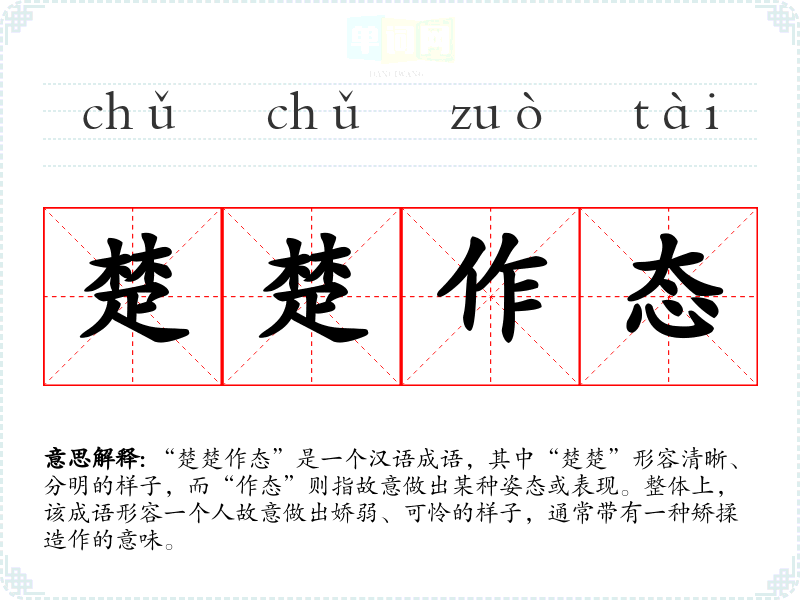 “楚楚作态”是一个汉语成语,其中“楚楚”形容清晰、分明的样子,而“作态”则指故意做出某种姿态或表现。整体上,该成语形容一个人故意做出娇弱、可怜的样子,通常带有一种矫揉造作的意味。
