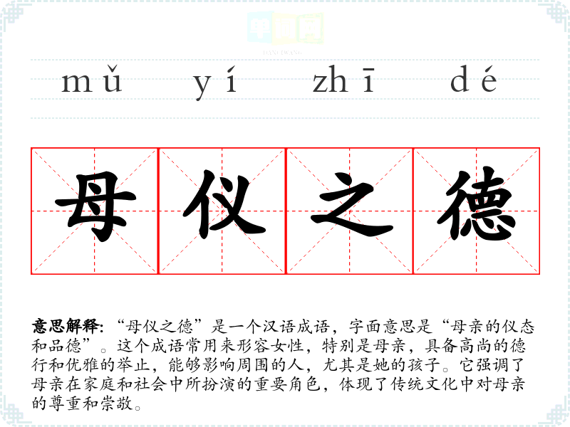 “母仪之德”是一个汉语成语,字面意思是“母亲的仪态和品德”。这个成语常用来形容女性,特别是母亲,具备高尚的德行和优雅的举止,能够影响周围的人,尤其是她的孩子。它强调了母亲在家庭和社会中所扮演的重要角色,体现了传统文化中对母亲的尊重和崇敬。