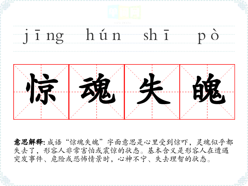 | 丧魂落魄 | 失去了魂魄。形容非常惊慌、恐惧的样子。 |