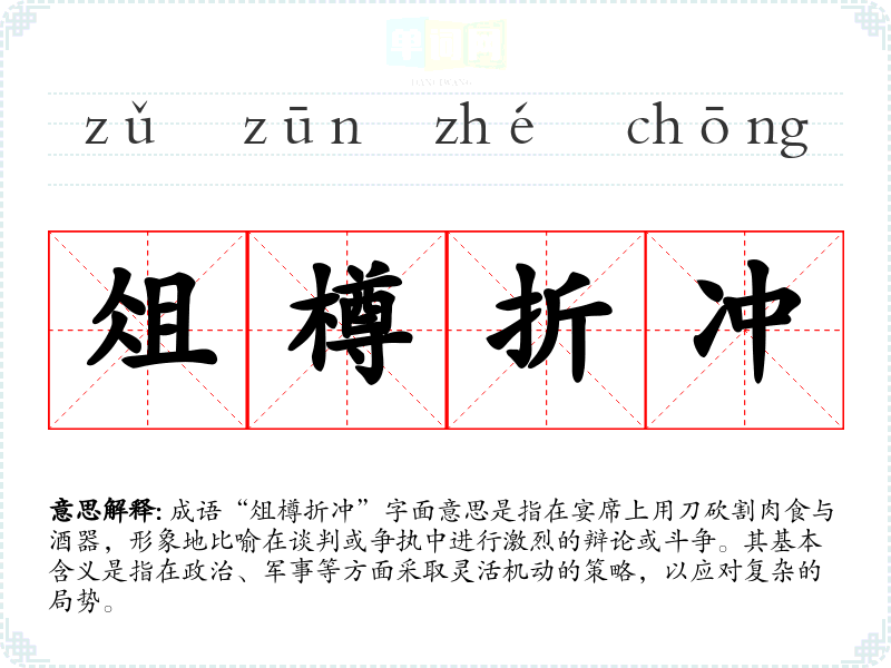 成语“俎樽折冲”字面意思是指在宴席上用刀砍割肉食与酒器,形象地比喻在谈判或争执中进行激烈的辩论或斗争。其基本含义是指在政治、军事等方面采取灵活机动的策略,以应对复杂的局势。
