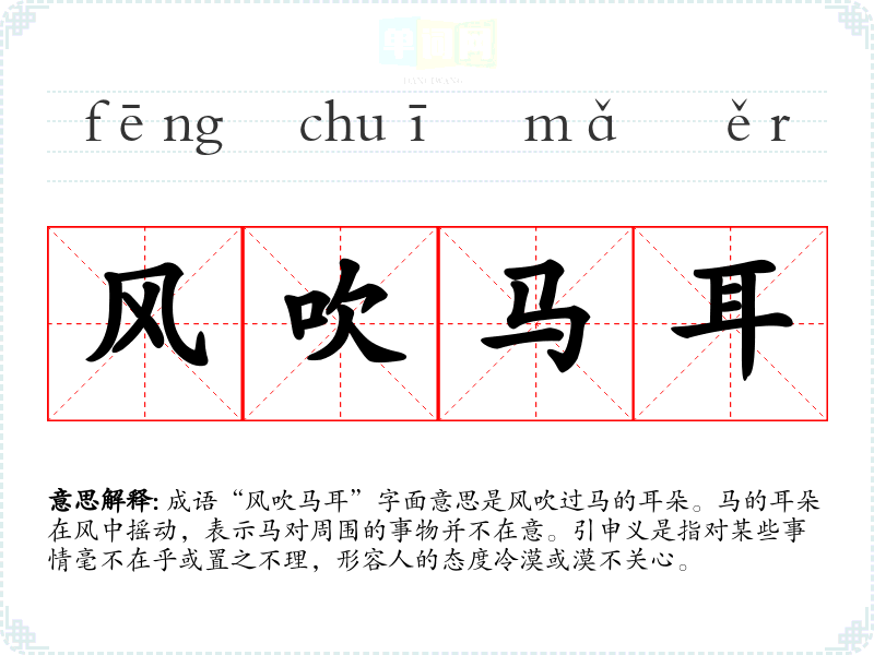 成语“风吹马耳”字面意思是风吹过马的耳朵。马的耳朵在风中摇动,表示马对周围的事物并不在意。引申义是指对某些事情毫不在乎或置之不理,形容人的态度冷漠或漠不关心。