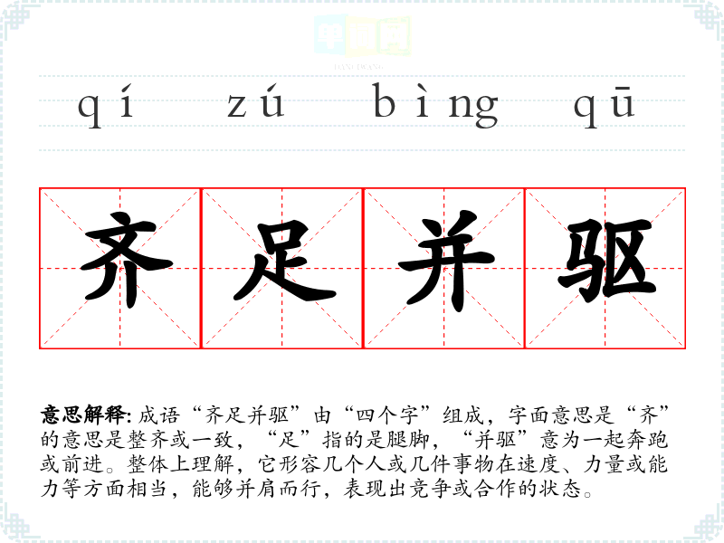 成语“齐足并驱”由“四个字”组成,字面意思是“齐”的意思是整齐或一致,“足”指的是腿脚,“并驱”意为一起奔跑或前进。整体上理解,它形容几个人或几件事物在速度、力量或能力等方面相当,能够并肩而行,表现出竞争或合作的状态。