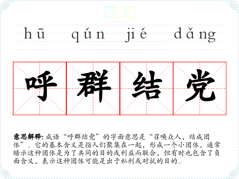 成语“呼群结党”的字面意思是“召唤众人,结成团体”。它的基本含义是指人们聚集在一起,形成一个小团体,通常暗示这种团体是为了共同的目的或利益而联合,但有时也包含了负面含义,表示这种团体可能是出于私利或对抗的目的。