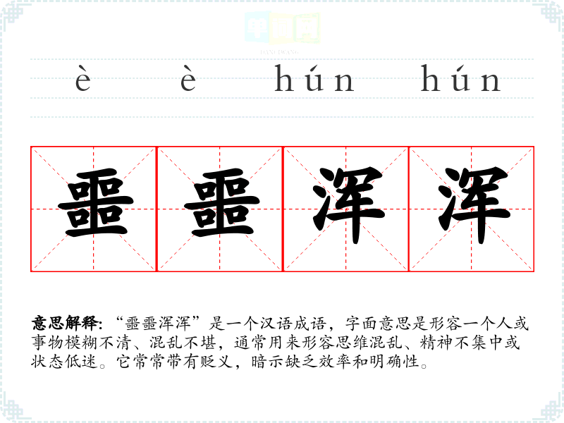 “噩噩浑浑”是一个汉语成语,字面意思是形容一个人或事物模糊不清、混乱不堪,通常用来形容思维混乱、精神不集中或状态低迷。它常常带有贬义,暗示缺乏效率和明确性。