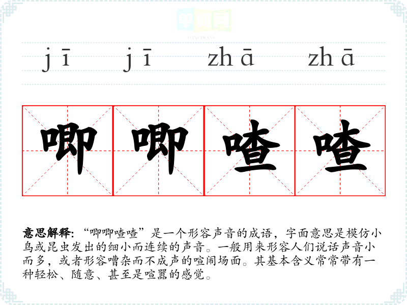 | 唧唧喳喳 | 形容杂乱尖细的声音。 |