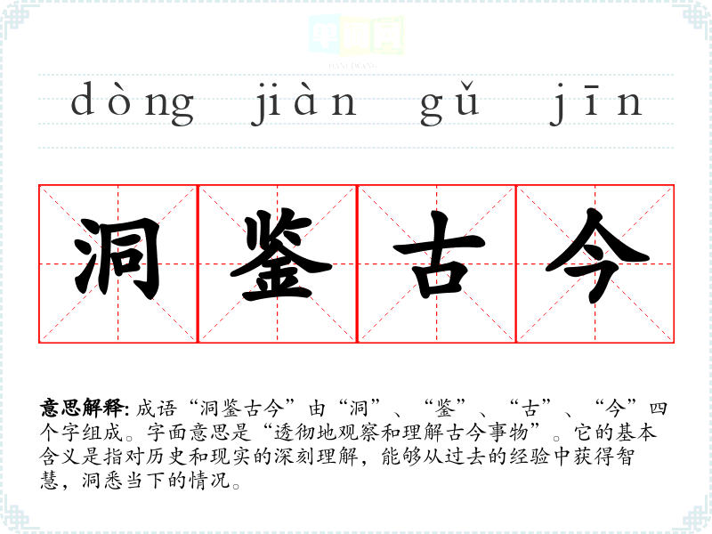 成语“洞鉴古今”由“洞”、“鉴”、“古”、“今”四个字组成。字面意思是“透彻地观察和理解古今事物”。它的基本含义是指对历史和现实的深刻理解,能够从过去的经验中获得智慧,洞悉当下的情况。