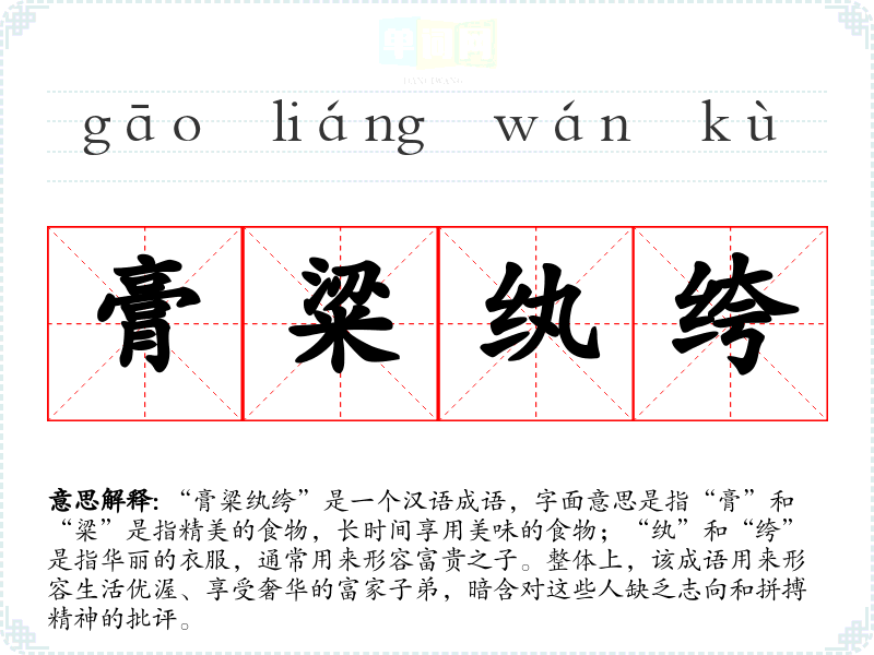“膏粱纨绔”是一个汉语成语,字面意思是指“膏”和“粱”是指精美的食物,长时间享用美味的食物;“纨”和“绔”是指华丽的衣服,通常用来形容富贵之子。整体上,该成语用来形容生活优渥、享受奢华的富家子弟,暗含对这些人缺乏志向和拼搏精神的批评。
