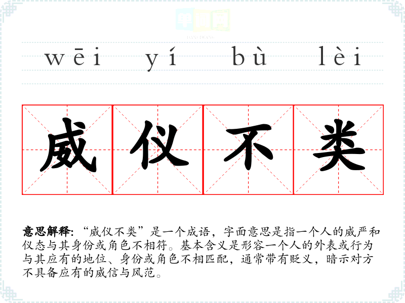 “威仪不类”是一个成语,字面意思是指一个人的威严和仪态与其身份或角色不相符。基本含义是形容一个人的外表或行为与其应有的地位、身份或角色不相匹配,通常带有贬义,暗示对方不具备应有的威信与风范。