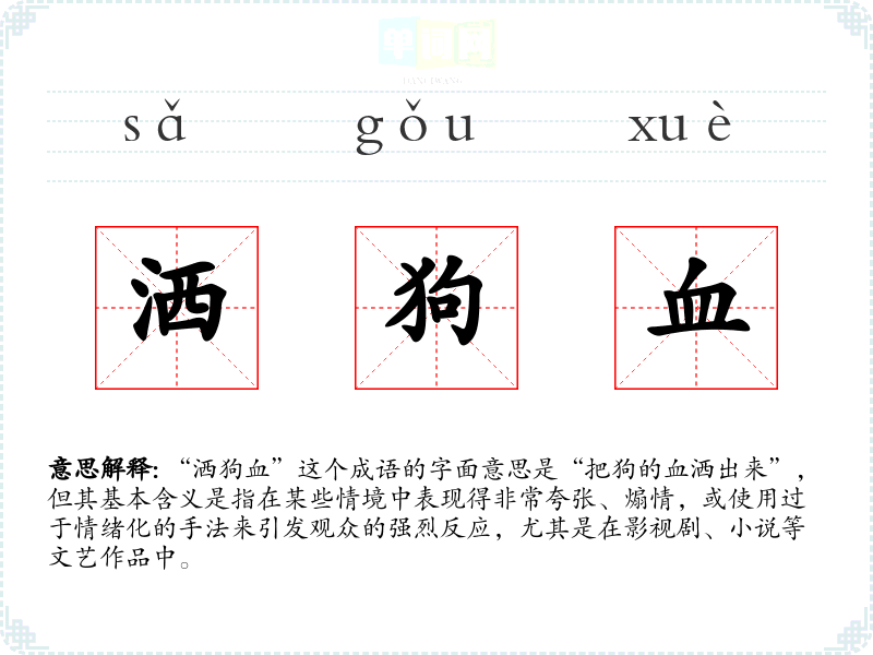 “洒狗血”这个成语的字面意思是“把狗的血洒出来”,但其基本含义是指在某些情境中表现得非常夸张、煽情,或使用过于情绪化的手法来引发观众的强烈反应,尤其是在影视剧、小说等文艺作品中。
