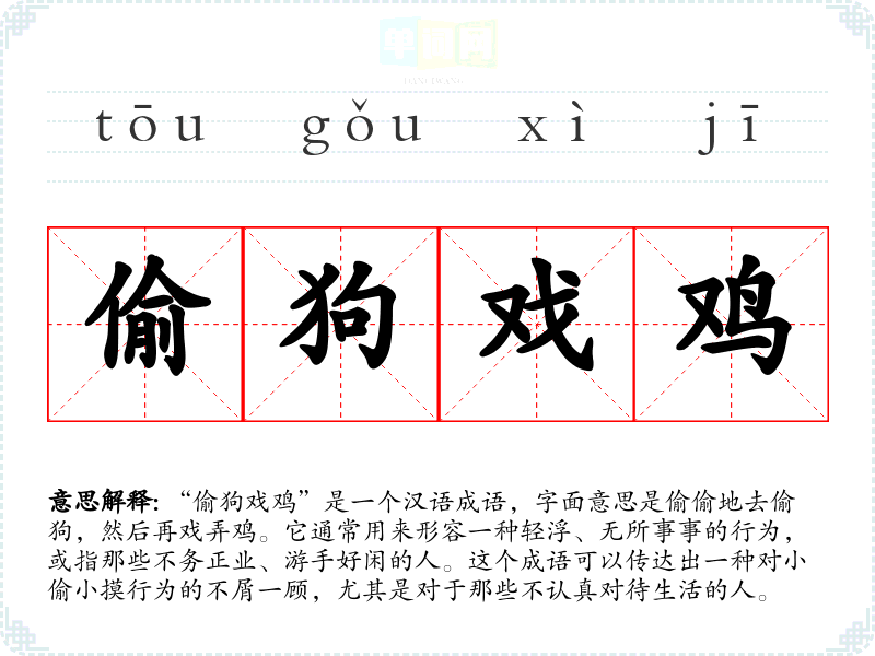 通过对“偷狗戏鸡”的学,我深刻体会到成语不仅是语言的组成部分,更是文化和社会价值观的体现。这一成语提醒我在生活中要珍惜时间,认真对待工作和学,避免沉迷于无意义的消遣。这样的反思在语言学*和表达中也极为重要,能够帮助我更好地理解和使用汉语。