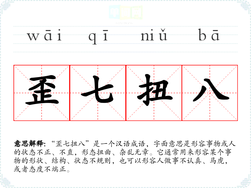 “歪七扭八”是一个汉语成语,字面意思是形容事物或人的状态不正、不直,形态扭曲、杂乱无章。它通常用来形容某个事物的形状、结构、状态不规则,也可以形容人做事不认真、马虎,或者态度不端正。