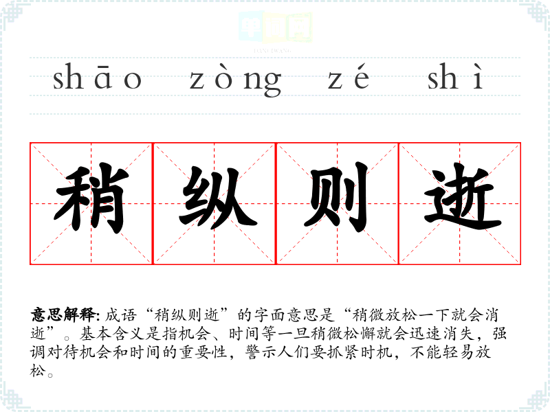 | 稍纵则逝 | 纵:放松;逝:失去。稍微一放松就消失了。形容时间或机会等很容易过去。 |