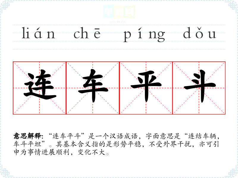 “连车平斗”是一个汉语成语,字面意思是“连结车辆,车斗平坦”。其基本含义指的是形势平稳,不受外界干扰,亦可引申为事情进展顺利,变化不大。