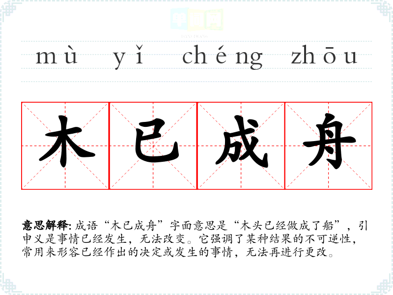 | 木已成舟 | 树木已经做成了船。比喻事情已成定局,无法改变。 |
