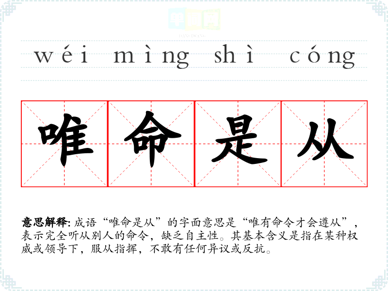 | 唯命是从 | 唯:唯独。是命令就服从。形容完全服从命令 |