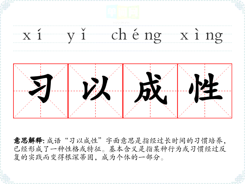 | 习以成性 | 习:习惯。习惯了就养成了性格。 |