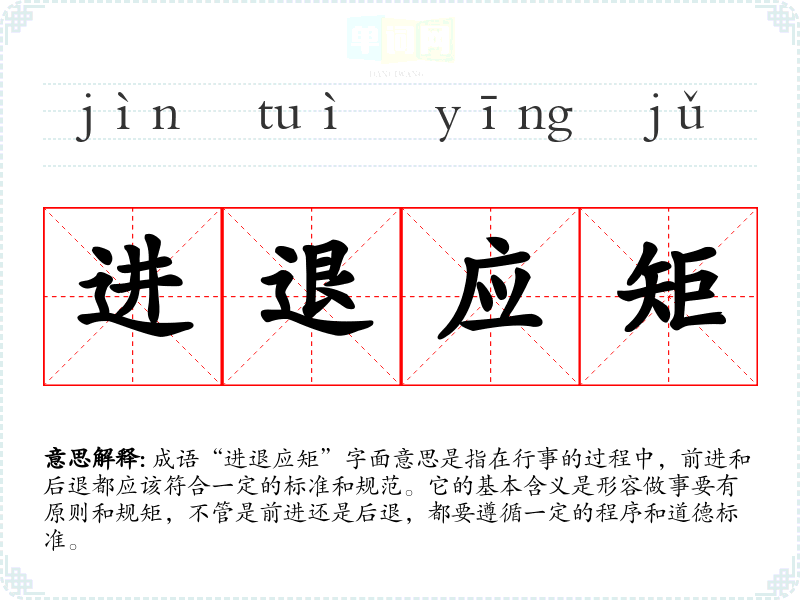 成语“进退应矩”字面意思是指在行事的过程中,前进和后退都应该符合一定的标准和规范。它的基本含义是形容做事要有原则和规矩,不管是前进还是后退,都要遵循一定的程序和道德标准。
