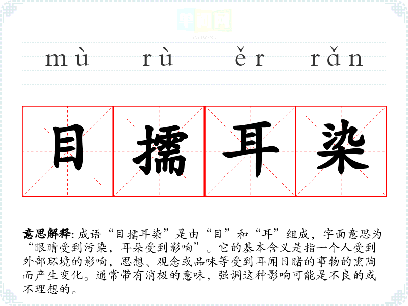 成语“目擩耳染”是由“目”和“耳”组成,字面意思为“眼睛受到污染,耳朵受到影响”。它的基本含义是指一个人受到外部环境的影响,思想、观念或品味等受到耳闻目睹的事物的熏陶而产生变化。通常带有消极的意味,强调这种影响可能是不良的或不理想的。