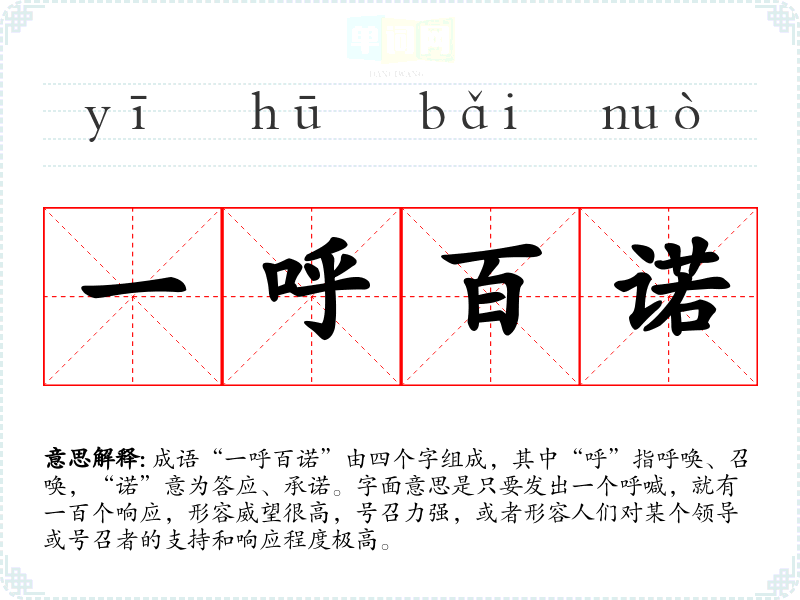 成语“一呼百诺”由四个字组成,其中“呼”指呼唤、召唤,“诺”意为答应、承诺。字面意思是只要发出一个呼喊,就有一百个响应,形容威望很高,号召力强,或者形容人们对某个领导或号召者的支持和响应程度极高。
