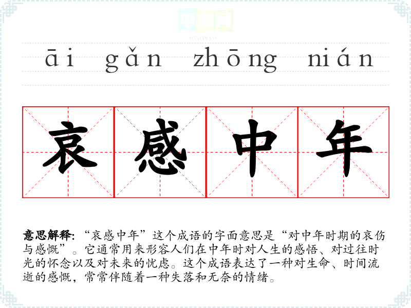 “哀感中年”这个成语的字面意思是“对中年时期的哀伤与感慨”。它通常用来形容人们在中年时对人生的感悟、对过往时光的怀念以及对未来的忧虑。这个成语表达了一种对生命、时间流逝的感慨,常常伴随着一种失落和无奈的情绪。