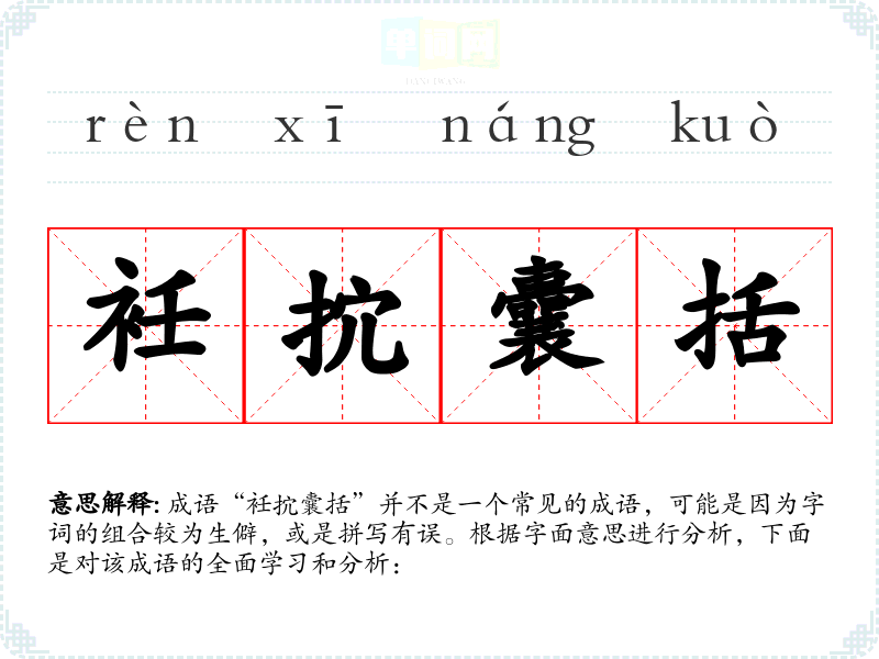 成语“衽抭囊括”并不是一个常见的成语,可能是因为字词的组合较为生僻,或是拼写有误。根据字面意思进行分析,下面是对该成语的全面学习和分析: