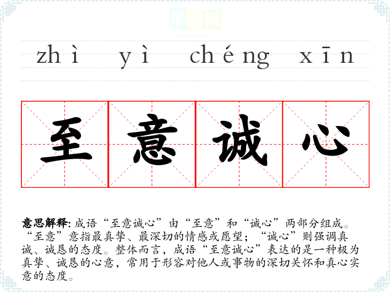 | 一片至诚 | 形容十分真挚诚恳。 |