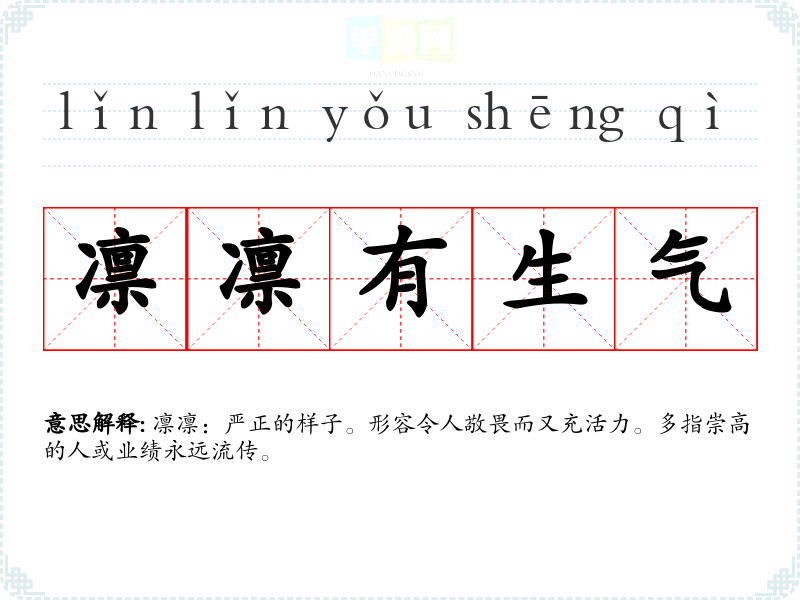 | 凛凛有生气 | 凛凛:严正的样子。形容令人敬畏而又充活力。多指崇高的人或业绩永远流传。 |