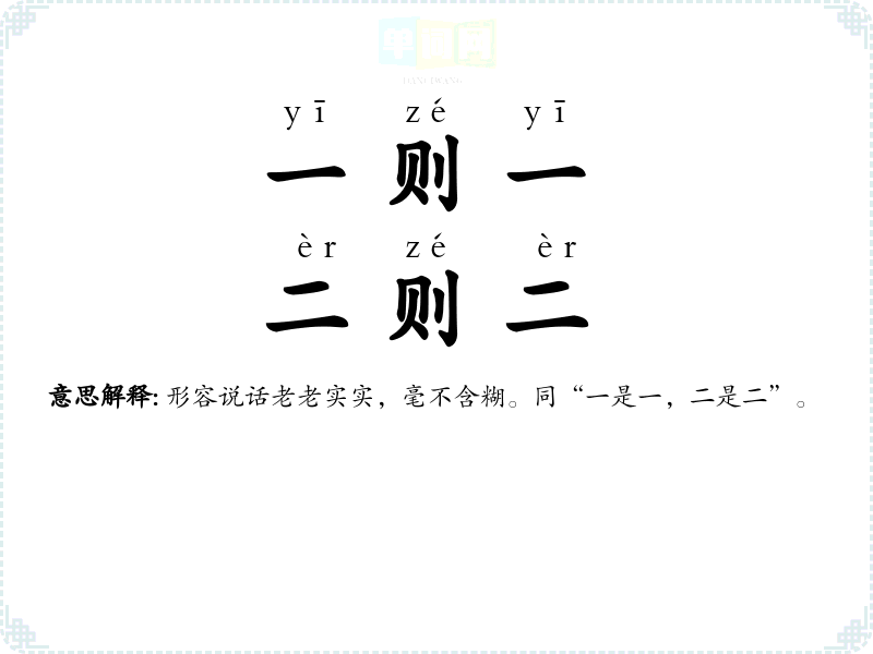 | 一则一,二则二 | 形容说话老老实实,毫不含糊。同“一是一,二是二”。 |
