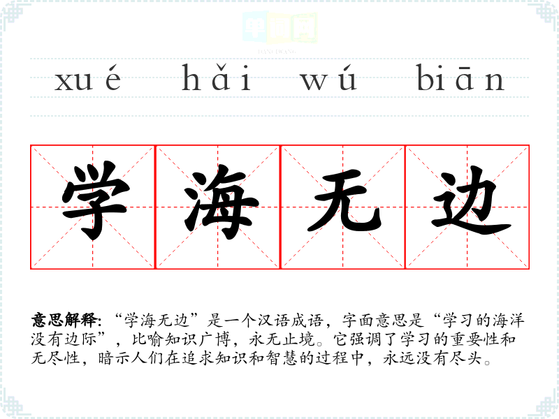 | 学海无边 | 学问的海洋没有边际。指对知识的学习和研究,永远没有完结的时候。 |