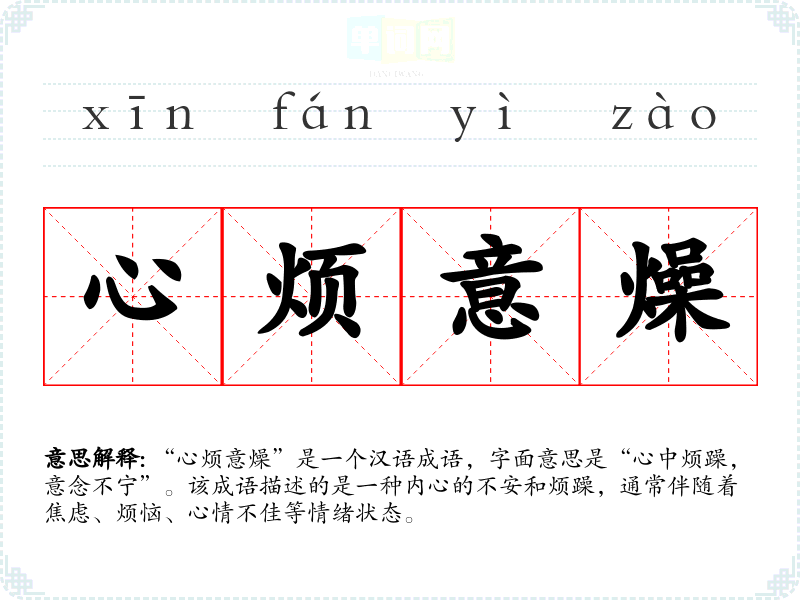 | 心烦意燥 | 心烦:心情烦躁;意燥:思想杂乱。心思烦乱,不知怎样才好。 |