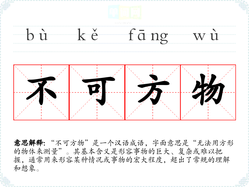 “不可方物”是一个汉语成语,字面意思是“无法用方形的物体来测量”。其基本含义是形容事物的巨大、复杂或难以把握,通常用来形容某种情况或事物的宏大程度,超出了常规的理解和想象。
