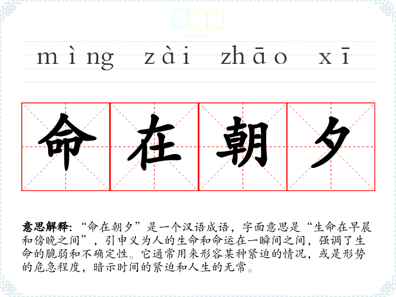“命在朝夕”是一个汉语成语,字面意思是“生命在早晨和傍晚之间”,引申义为人的生命和命运在一瞬间之间,强调了生命的脆弱和不确定性。它通常用来形容某种紧迫的情况,或是形势的危急程度,暗示时间的紧迫和人生的无常。
