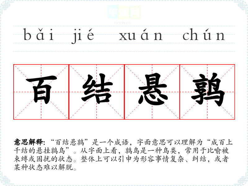 在**传统文化中,鸟类常常被用作自由与束缚的象征。成语“百结悬鹑”反映了人们对生活中困境的思考,尤其是在面对情感纠葛和复杂人际关系时。在现代社会,这个成语仍然有适用性,可以用来描述职场、家庭等多方利益交织的复杂局面。