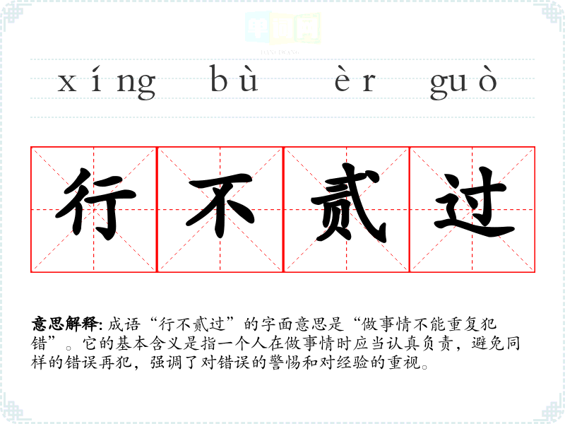 成语“行不贰过”的字面意思是“做事情不能重复犯错”。它的基本含义是指一个人在做事情时应当认真负责,避免同样的错误再犯,强调了对错误的警惕和对经验的重视。