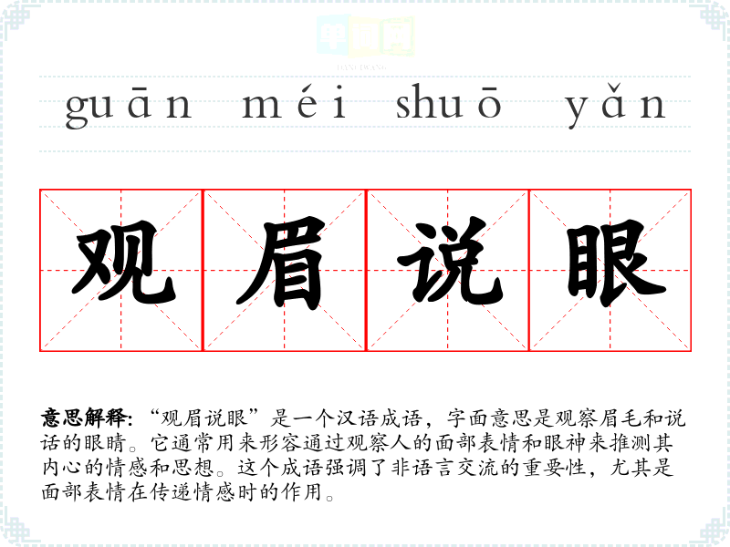 “观眉说眼”是一个汉语成语,字面意思是观察眉毛和说话的眼睛。它通常用来形容通过观察人的面部表情和眼神来推测其内心的情感和思想。这个成语强调了非语言交流的重要性,尤其是面部表情在传递情感时的作用。