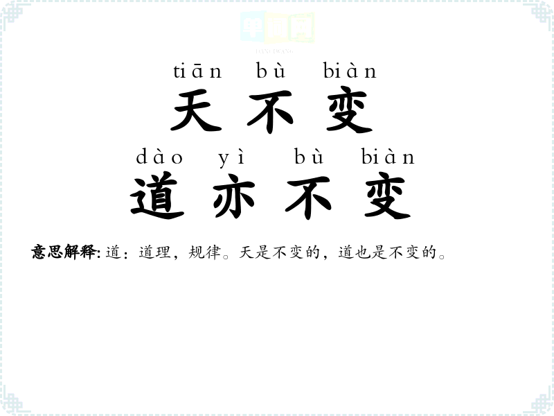 | 天不变,道亦不变 | 道:道理,规律。天是不变的,道也是不变的。 |