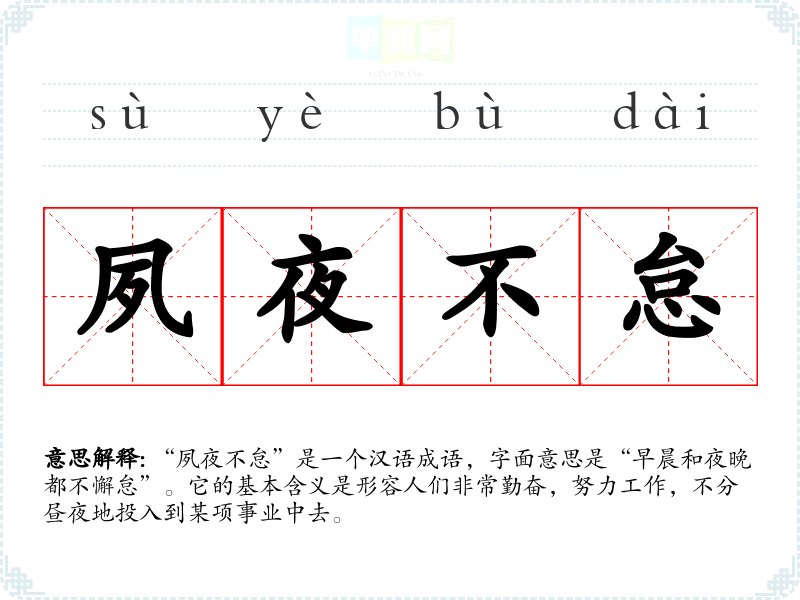 “夙夜不怠”是一个汉语成语,字面意思是“早晨和夜晚都不懈怠”。它的基本含义是形容人们非常勤奋,努力工作,不分昼夜地投入到某项事业中去。